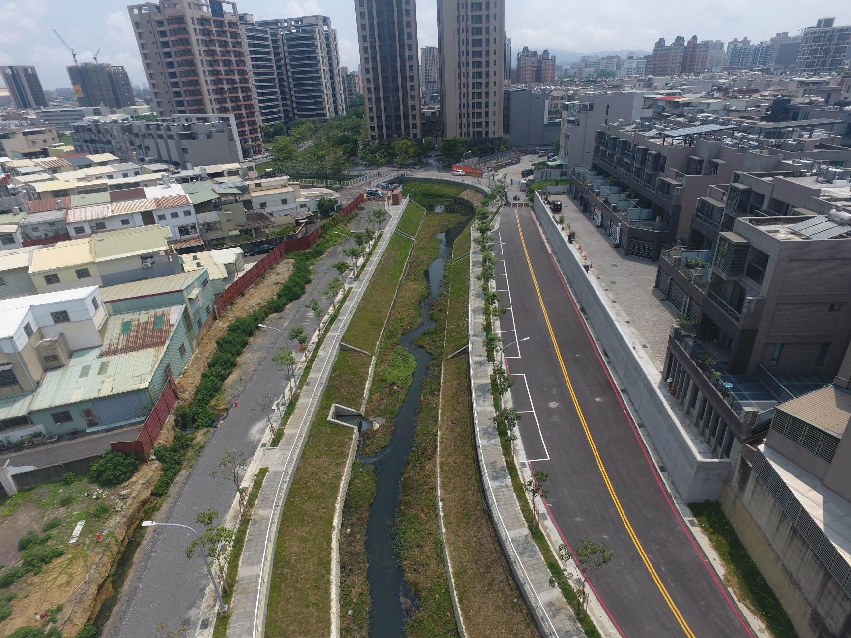 本工程主要工項為排水設施工程、護岸及擋土牆工程、景觀橋工程、道路工程、照明系統及景觀園道設施等。